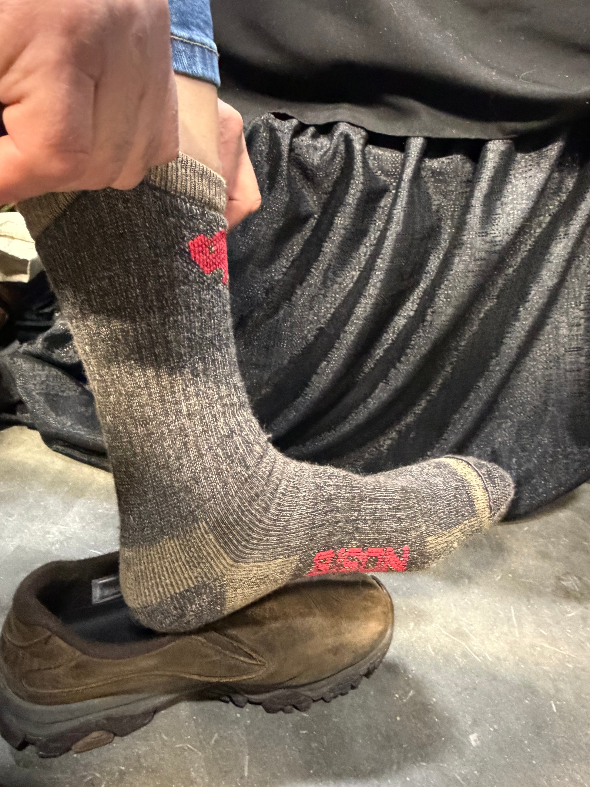 Made with 30% Bison down and a combination of superfine Alpaca and nylon (for strength) that have a reinforced toe and heel areas for long lasting soft warm socks.