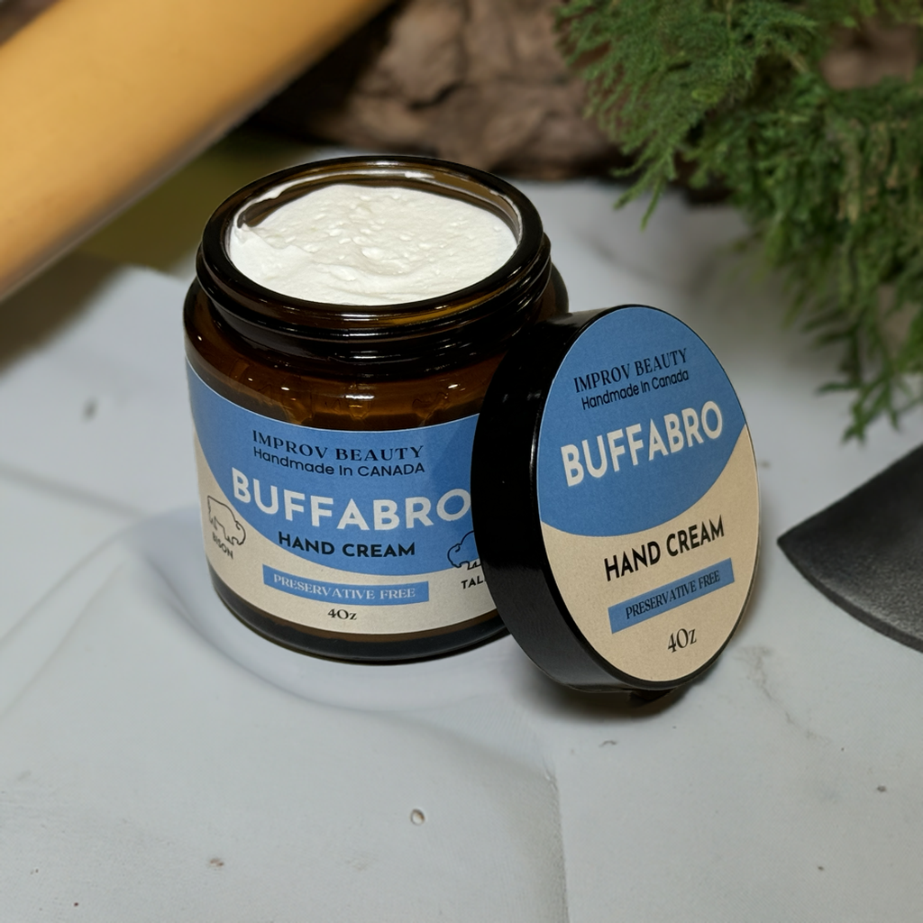 Our HAND CREAM contains bison tallow, sunflower oil, olive oil, and essential oils of: Cedarwood & Rosewood.